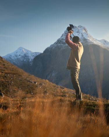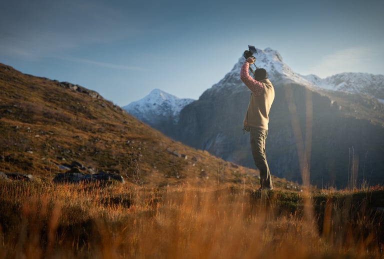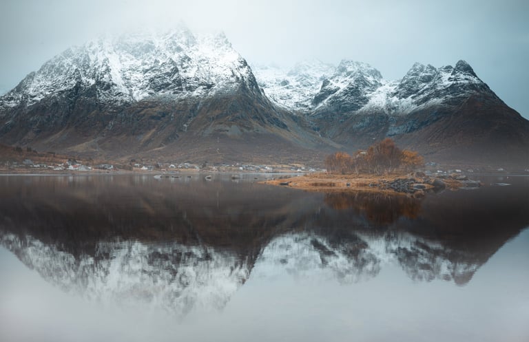 Jednak jesień ma swój niepowtarzalny urok. To czas, gdy krajobraz zmienia się zupełnie – górskie szczyty wciąż surowe, ale teraz otulone kolorami jesieni. Niskie chmury, mgły snujące się po wodach fiordów i długie cienie rzucane przez słońce sprawiają, że Lofoty zyskują nową, bardziej nostalgiczną atmosferę.