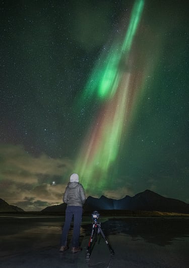 Zorza szybko nabrała intensywności, migocząc i zmieniając kolory – od głębokiej zieleni po odcienie fioletu. To była jedna z tych chwil, kiedy trudno oderwać wzrok, a jeszcze trudniej zdecydować, czy skupić się na robieniu zdjęć, czy po prostu chłonąć ten widok. To, że zorza pokazała się akurat ostatniej nocy, po wielu dniach pochmurnej pogody, było jak nagroda za cierpliwość, za wyrozumiałość dla północnej pogody i wiarę w to, że natura potrafi zaskoczyć. Czasami najbardziej magiczne chwile przychodzą zupełnie niespodziewanie...