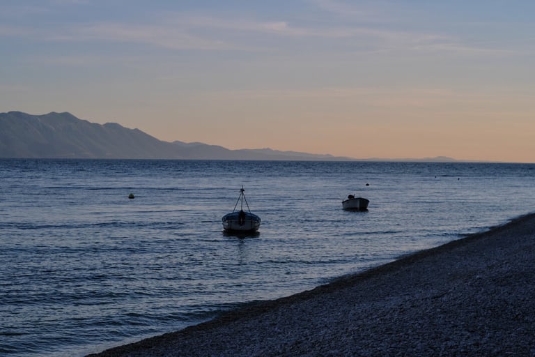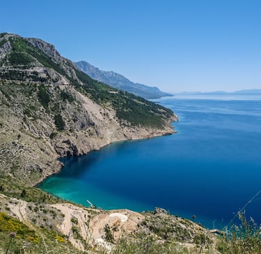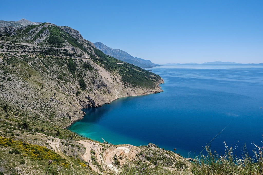 Dalmacja słynie ze skalistych wybrzeży. Droga na południe była naprawdę piękna. Musiałam zatrzymać się, choć na chwilę przy jednej z najpiękniejszych plaż, na jakich byłam — plaży Vruja. Znajduje się ona kilka kilometrów za miastem Omiš. Jest bardzo trudno dostępna, dlatego zwykle jest pusta. Zejście do niej jest strome i długie, a po drodze nie ma żadnej wysokiej roślinności, ani cienia. Na tej plaży Anika nauczyła się pływać rok temu. Niestety zejście na dół z Nacho nie wchodziło w grę, ale z sentymentu zrobiłyśmy krótki postój na zdjęcie i wspominki.