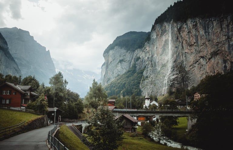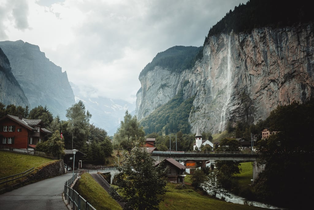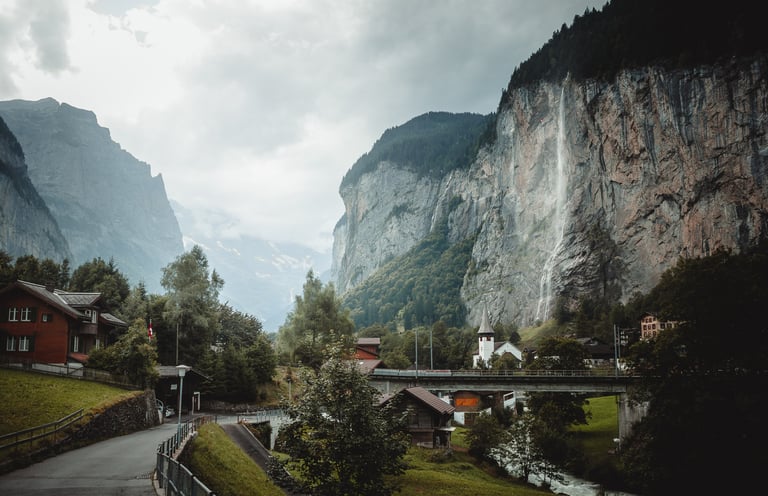Jak mówili mi rodzice, nie ma złej pogody, są tylko źle ubrani ludzie, dlatego nie marnując pozostałego nam czasu, pojechaliśmy na spacer po Lauterbrunnen - dolinie wodospadów otoczonej skalnymi ścianami, słynącej z miasteczka o tej samej nazwie. Najbardziej rozpoznawalnym punktem tej doliny jest wodospad Staubbach, który spada na miasteczko z wysokości aż 300 metrów. Przeszliśmy ulicami miasta, trafiając w okno pogodowe między jedną, a drugą ulewą.