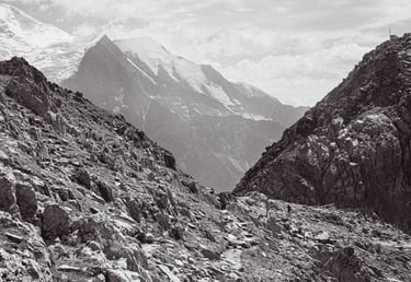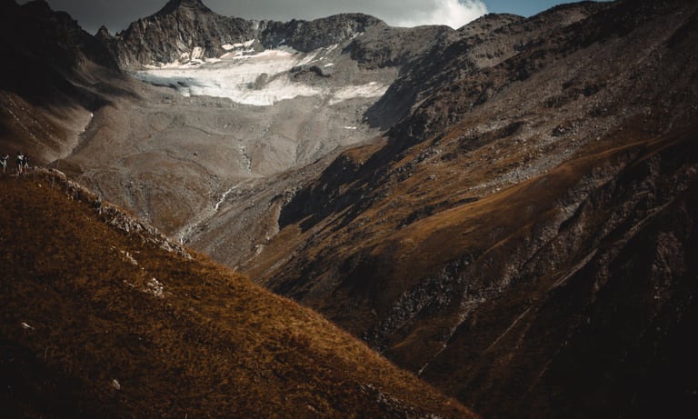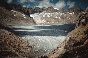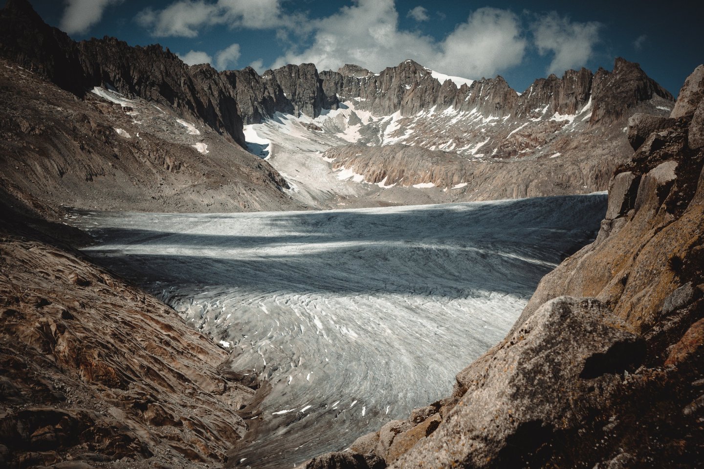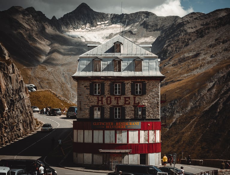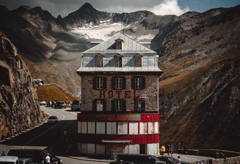 Nieco poniżej grzbietu przełęczy znajdował się kolejny punkt, w którym postawiłam swoją przysłowiową pinezkę. To historyczny budynek i chyba jeden z najpiękniej położonych hoteli - Belvédère. Zbudowano go pod koniec XIX wieku w czasach, gdy język Lodowca Rodanu, na który skierowane są jego okna, kończył się zaledwie 180 metrów od progu hotelu. Bliskość lodowca była powodem, dla którego w tamtych czasach Belvédère znajdował się na szczytach list atrakcji turystycznych. Odwiedzał go oczywiście sam James Bond (Sean Connery), ale też Papież oraz inne sławy i osobliwości. Niestety kolejnych 100 lat przyniosło globalne ocieplenie, a czoło lodowca cofnęło się o ponad 1,5 kilometra, gubiąc nawet po 10 centymetrów długości dziennie. Zmniejszyło to atrakcyjność hotelu i tym samym napływ turystów.
