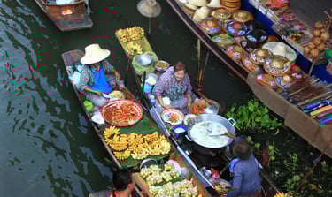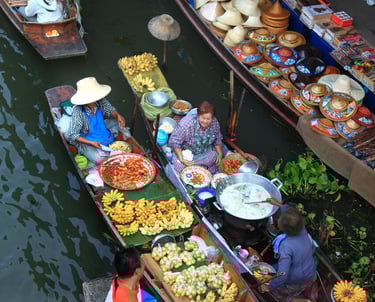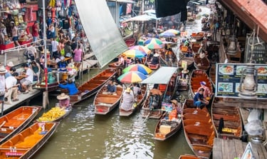 To dzień targowisk. Odwiedzimy Maeklong Railway Market, gdzie handel toczy się… na czynnych torach kolejowych! Następny przystanek to Damnoen Saduak uważany jest za jeden z ostatnich autentycznych, pływających targów w Tajlandii. Zamiast straganów i wąskich uliczek zastaniesz tu długie, drewniane łodzie, wypełnione po brzegi kolorowymi owocami i warzywami. Rejs łodzią to wspaniała okazja na skosztowanie tradycyjnych potraw oraz przyjrzenie się lokalnej ludności w atmosferze tradycyjnego, tajskiego targowiska.