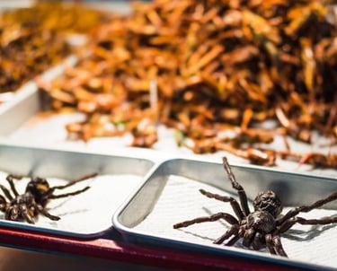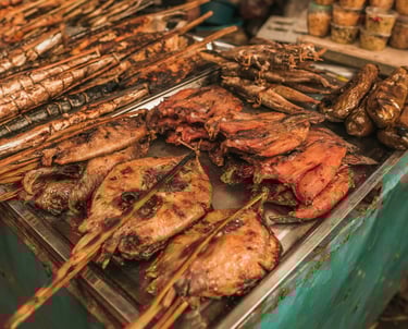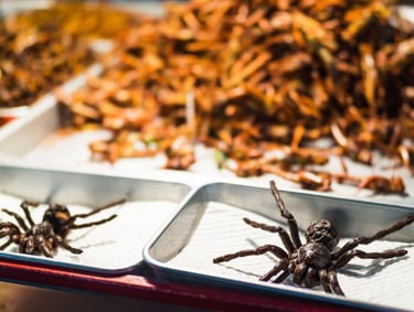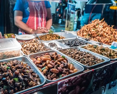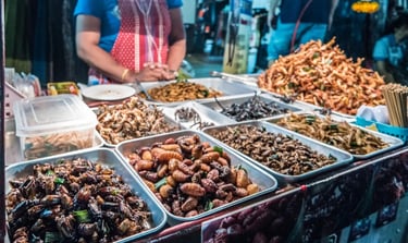 Możliwość spróbowania prażonego pasikonika i innych lokalnych rarytasów na nocnym markecie w Bangkoku